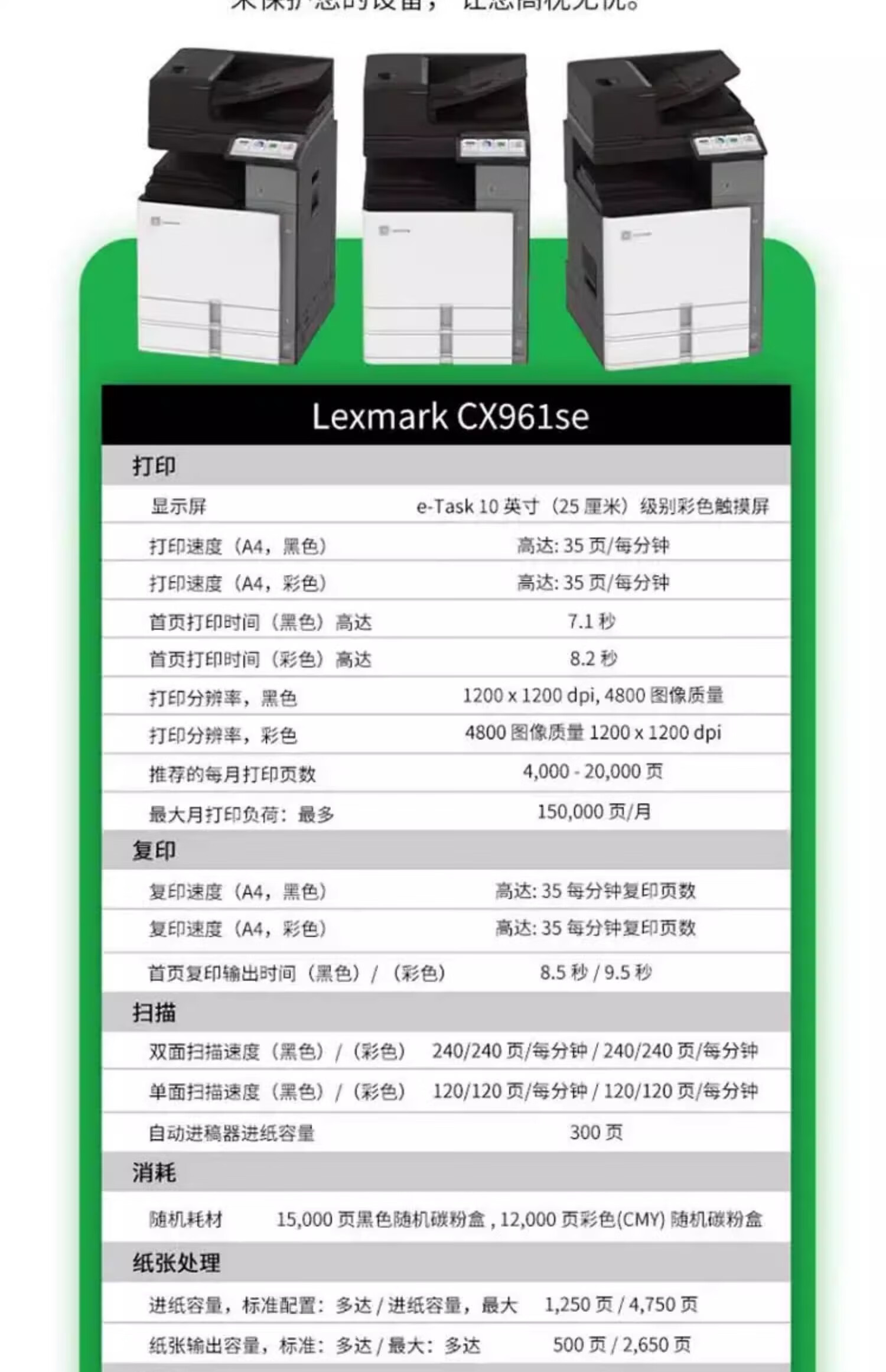 利盟(Lexmark)CX961se复印机 彩色激光多功能数码复合机打印机 35页/分钟 输稿器 双纸盒参数图片